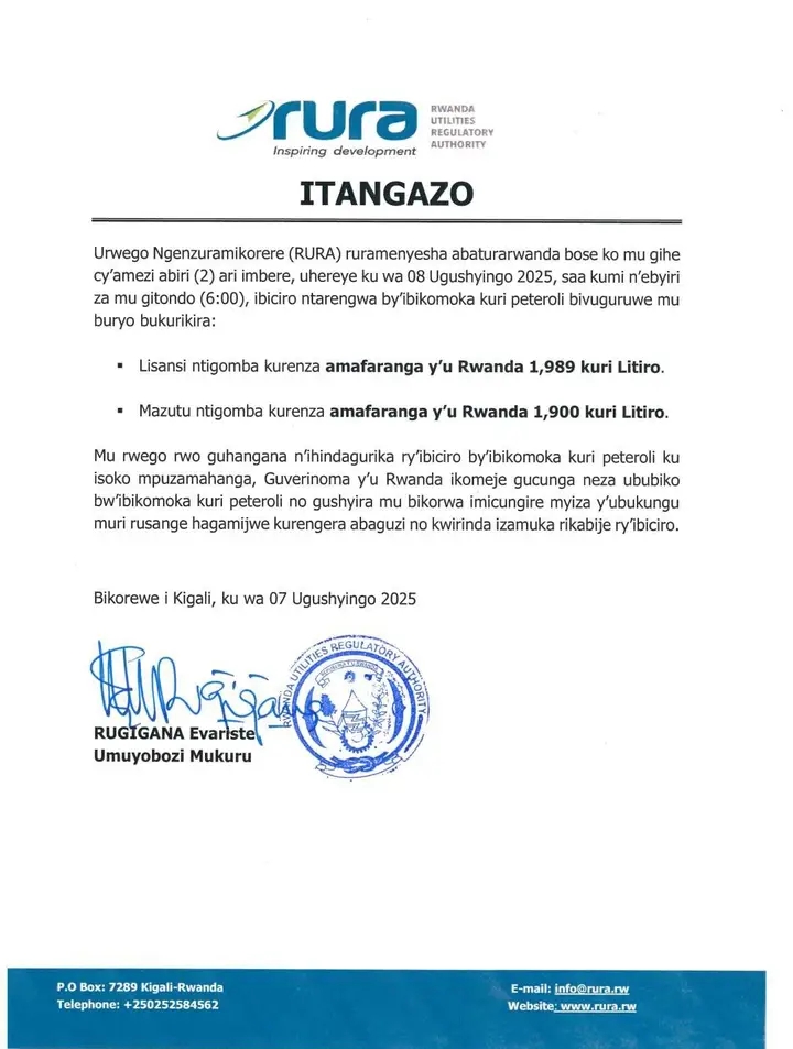 Kuri uyu wa Gatanu, Nibwo Urwego rushinzwe kugenzura imikorere y’inzego zimwe z’imirimo ifitiye Igihugu Akamaro (RURA), rwatangaje ko guhera saa kumi n’ebyiri za mu gitondo zo kuri uyu wa Gatandatu tariki 8 Ugushyingo 2025, ibiciro bishya bya lisansi na Mazutu bitangira gukurikizwa.